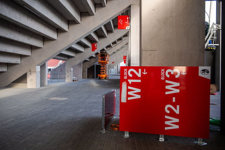 Die Tribünen stehen, der Rasen ist verlegt, die ersten Schilder wurden aufgestellt: Die neue Freiburger Fußball-Arena wird in Kürze fertig. Ziel des neuen Leitsystems ist es, ein harmonisches Gesamtkonzept von Architektur und Signaletik zu erzielen. Das Leitsystem greift vorhandene Gestaltungen / die Farbwelt des Corporate Designs des SC Freiburgs auf. Der Spielbetrieb im neuen Stadion kann beginnen.