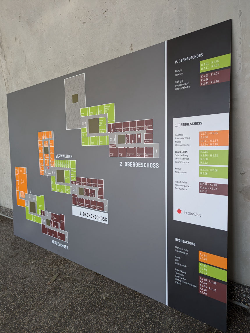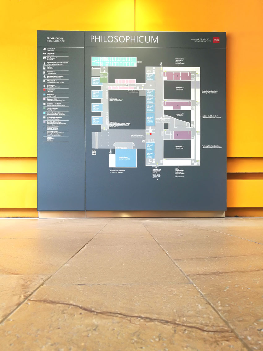 In Zusammenarbeit mit Moser.Design haben wir das Leit- und Orientierungssystem für das Philosophicum I in der Johannes Gutenberg Universität in Mainz realisert. Großformatige Übersichtspläne und Etagenübersichten erleichtern die Orientierung im Gebäude.