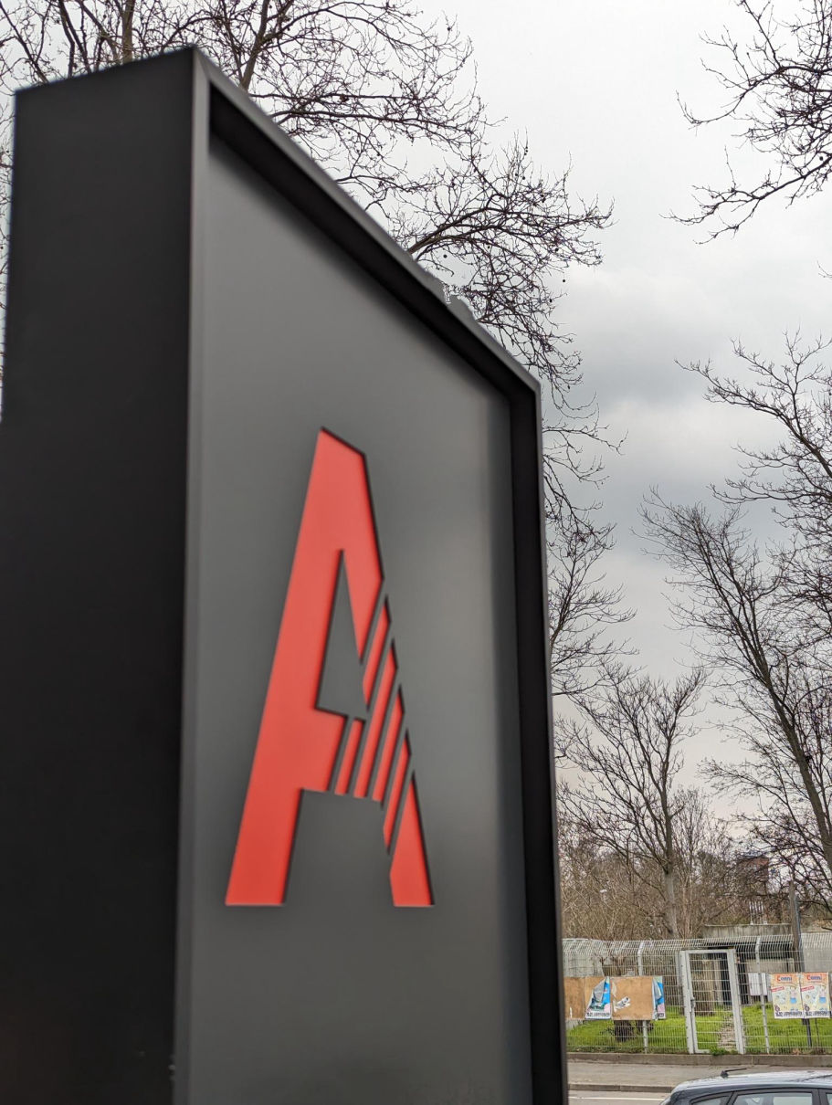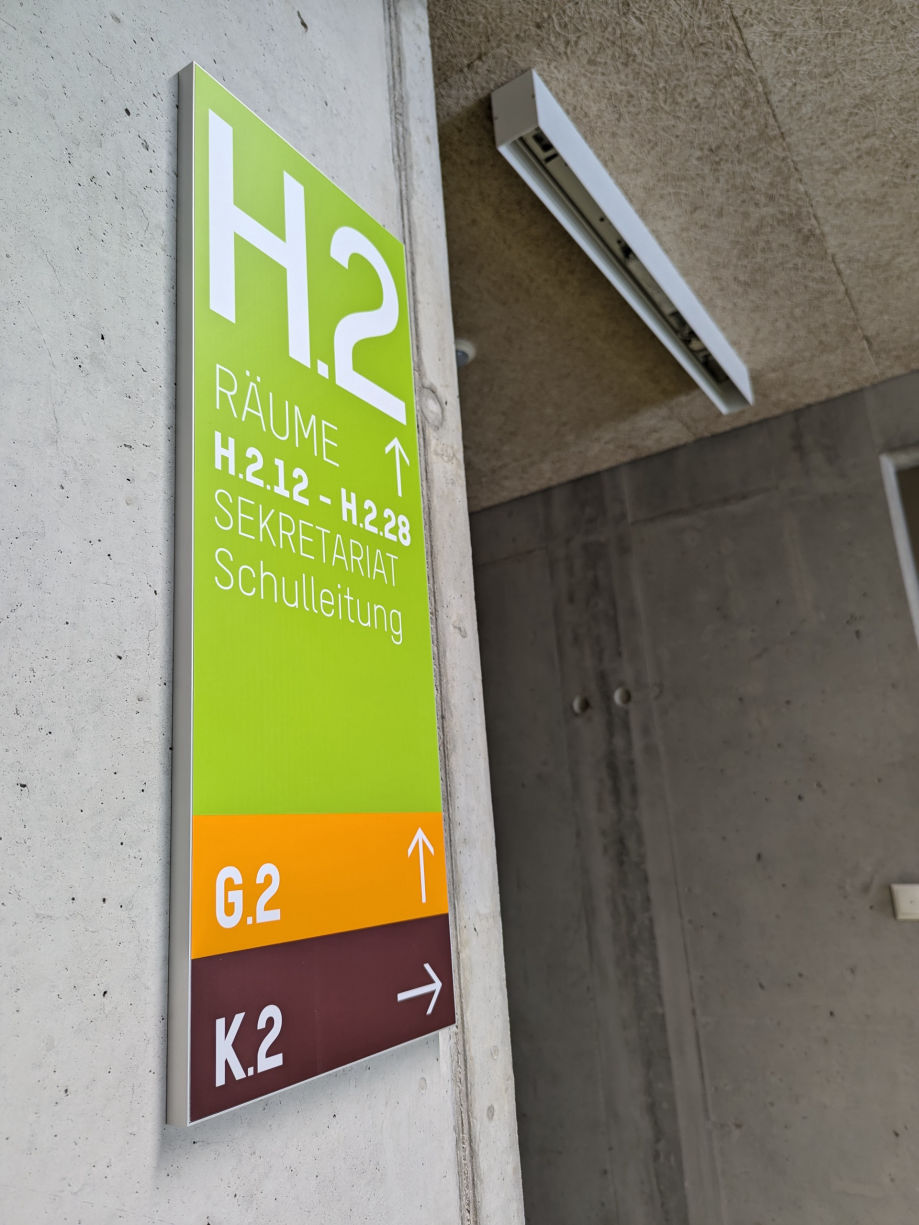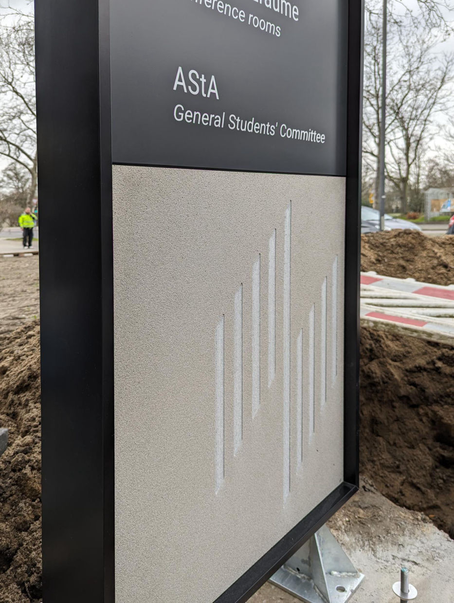 Nach über neun Jahren Planung und Abstimmungsarbeit wird unser Leit- und Orientierungssystem auf dem Campus der Hochschule für Wirtschaft und Gesellschaft in Ludwigshafen installiert. Die Elemente im Außenbereich überzeugen durch einen Materialmix aus Glasfaserbeton, pulverbeschichtetem Aluminium und farbigem Acrylglas.