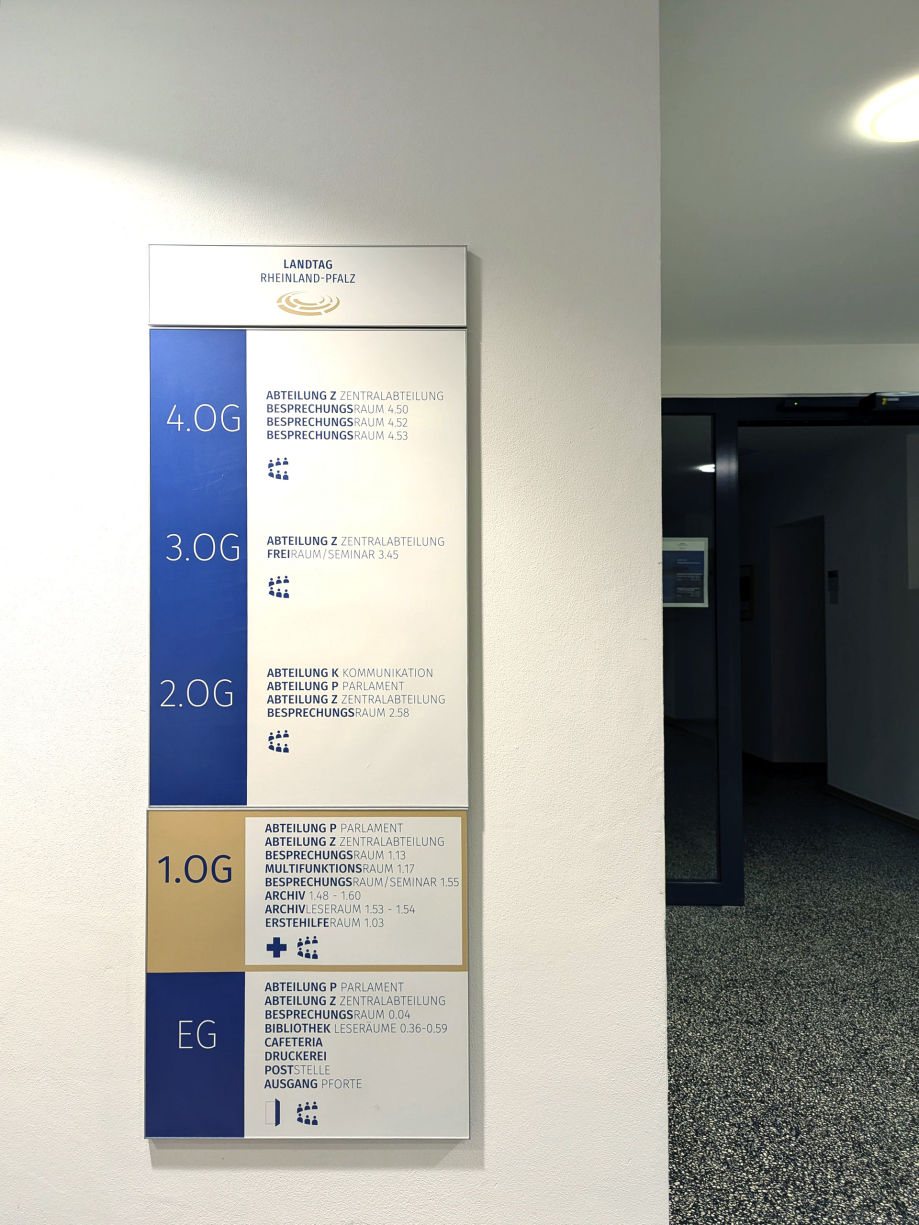 Der Hauptsitz der Landtagsverwaltung Rheinland-Pfalz im Isenburg-Karree – einer ehemaligen Justizvollzugsanstalt, die zu einem modernen Bürogebäude umgebaut wurde – erhielt eine neue Beschilderung, die dem aktuellen Corporate Design angepasst ist.
