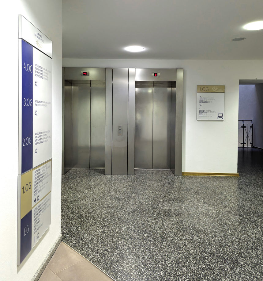 Der Hauptsitz der Landtagsverwaltung Rheinland-Pfalz im Isenburg-Karree – einer ehemaligen Justizvollzugsanstalt, die zu einem modernen Bürogebäude umgebaut wurde – erhielt eine neue Beschilderung, die dem aktuellen Corporate Design angepasst ist.